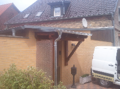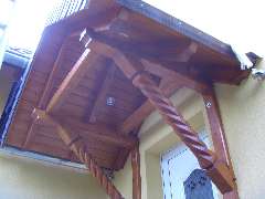 Pultvordach mit Schmuckholz (Seilhieb Muster) und Windfang
